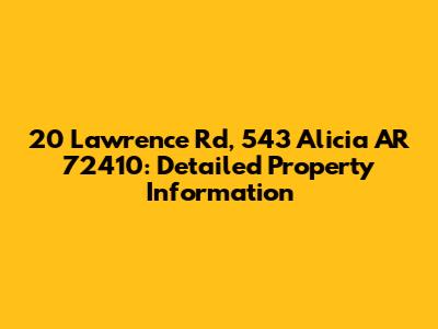 Are you looking for detailed information on 20 Lawrence Rd, located at 543 Alicia, Arkansas (AR) 72410? You've landed in the right place! This article will delve into everything you need to know about this specific property, from its location and basic details to potentially uncovering more in-depth information such as property value, ownership history, and more. So, let's get started and explore what makes this address unique.